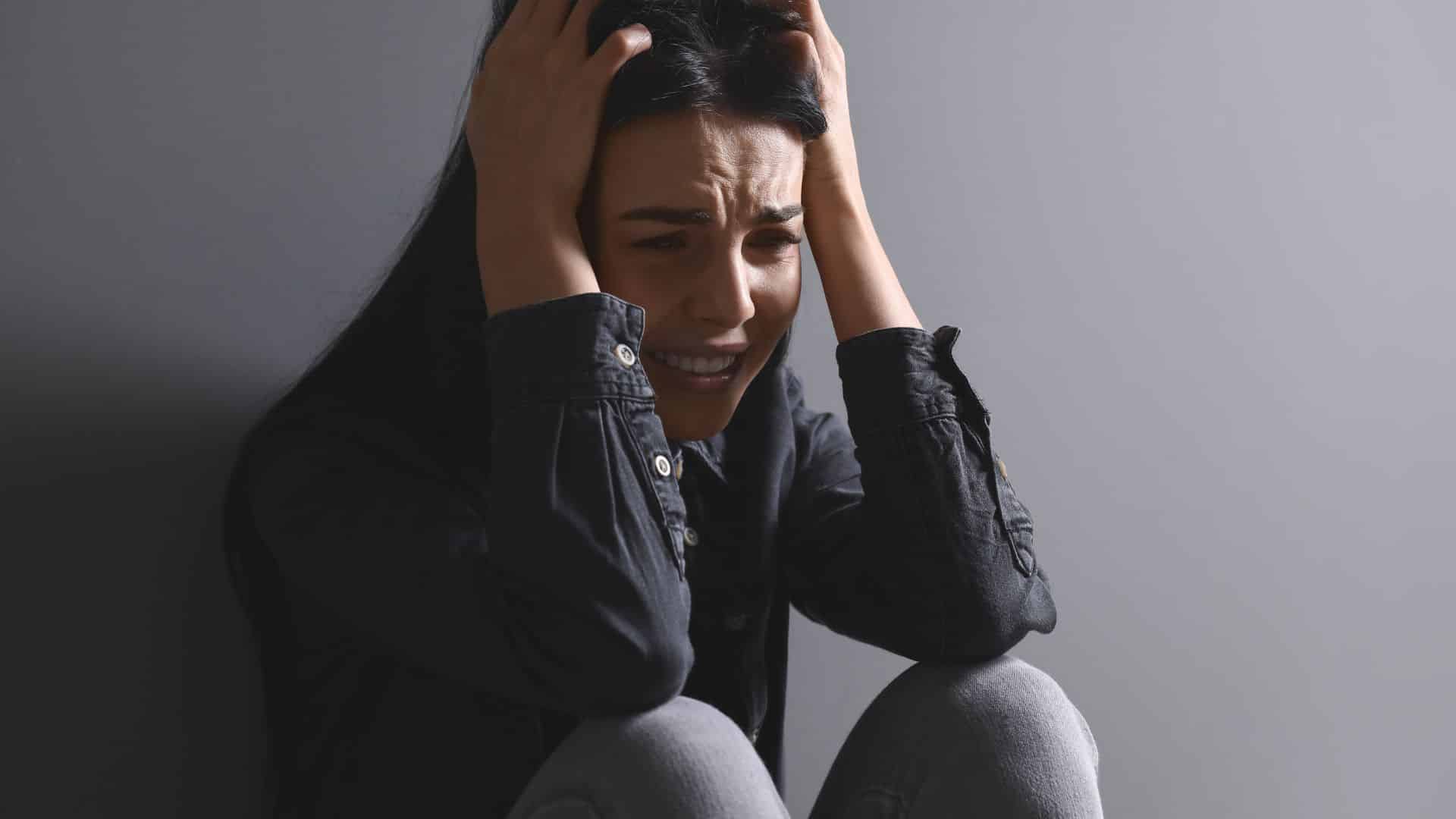 Imagem de uma mulher que está sofrendo e em uma situação de violência.