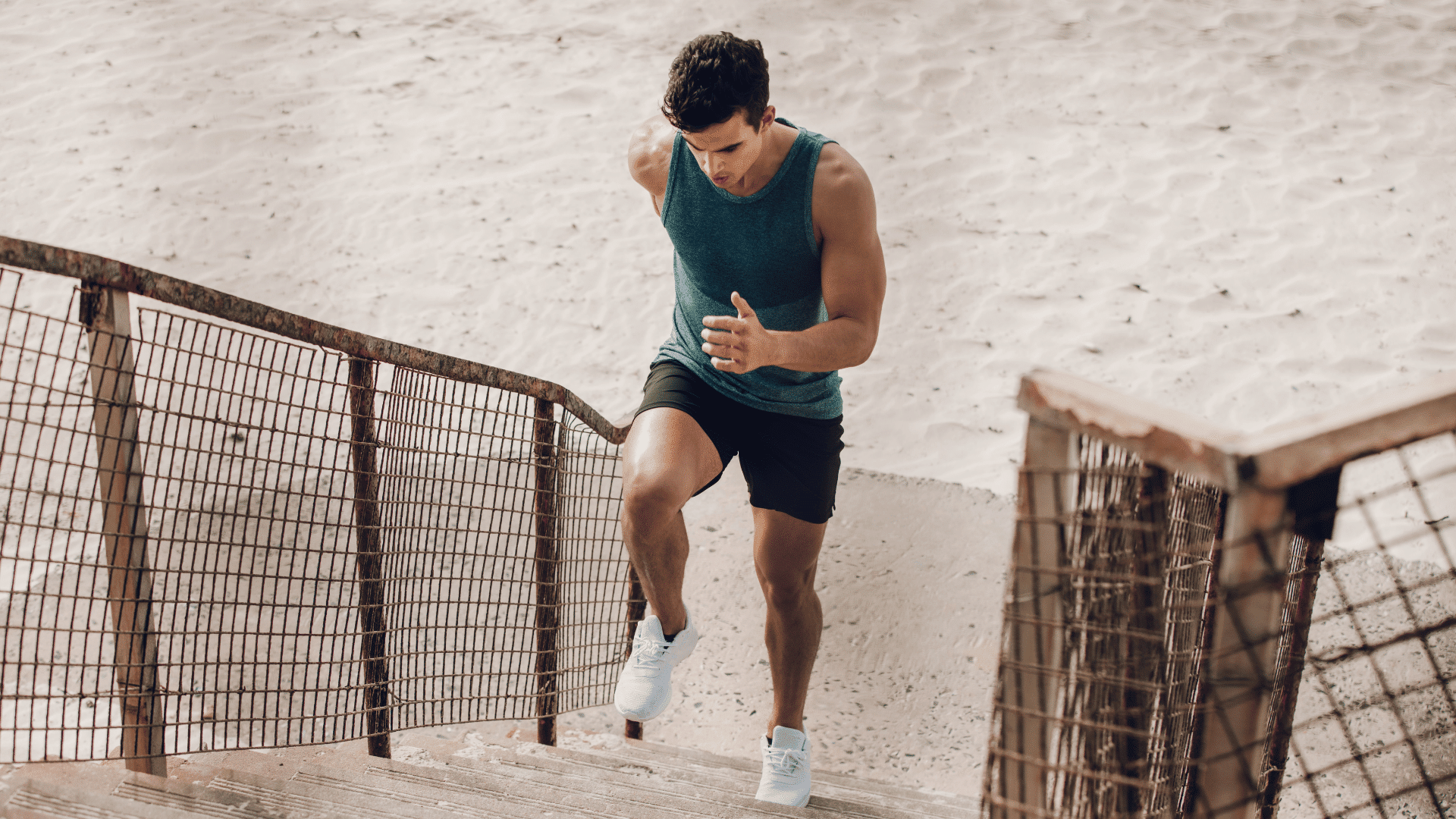 Um homem jovem está praticando exercício em uma praia. Ele corre, enquanto sobe uma escada de madeira.
