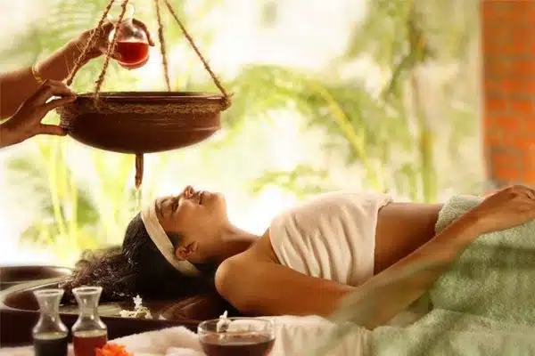Mulher deitada em maca, com uma tigela de barro pendurara em cima de sua cabeça.