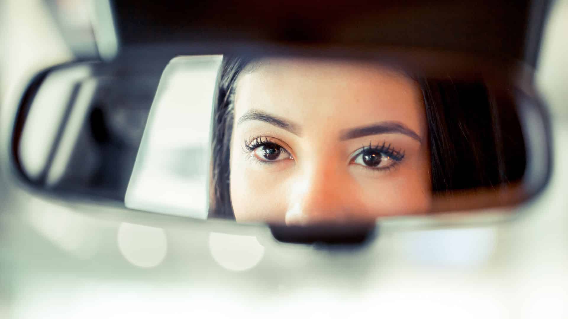 Imagem de uma mulher olhando pelo retrovisor de um carro, trazendo o conceito: quem sou eu?