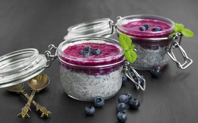61686444 - fresh chia pudding desserts with blueberry topping and mint