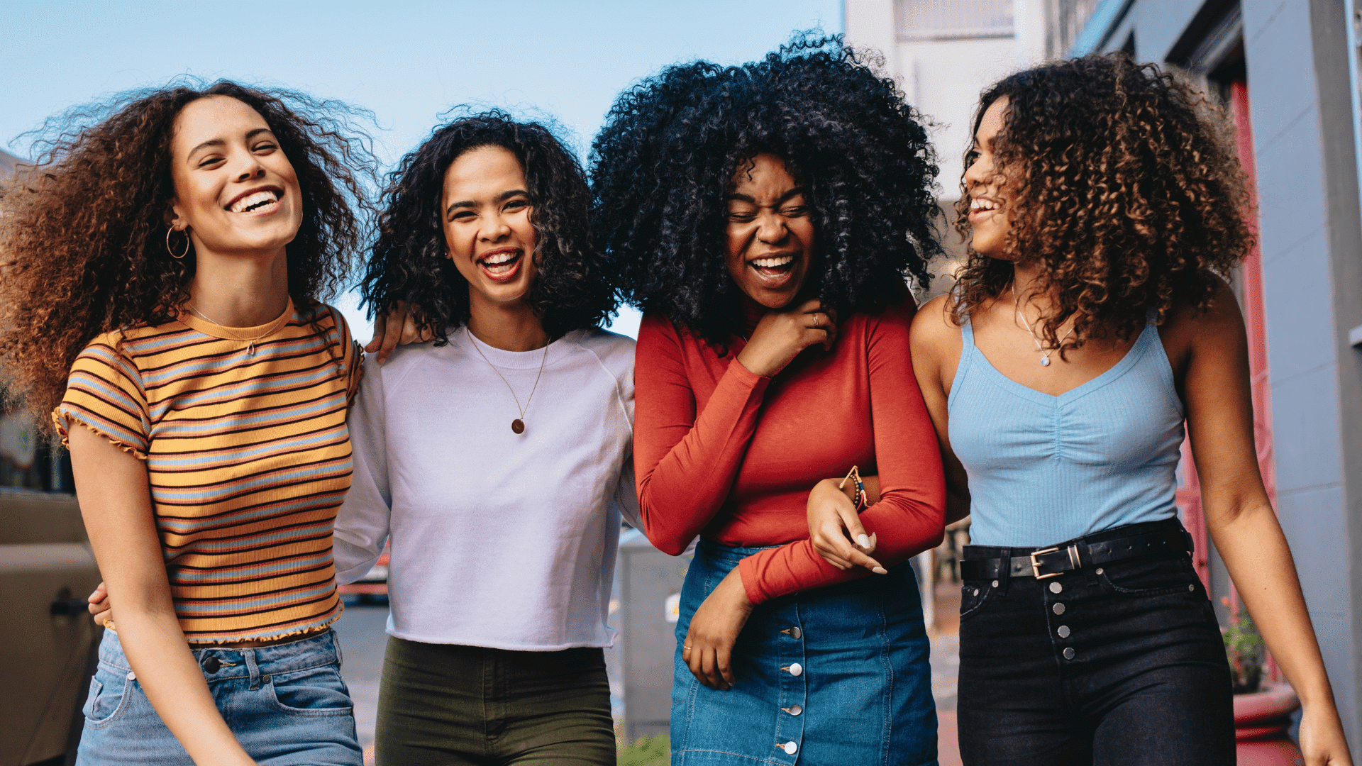 Um grupo de quatro mulheres negras e jovens caminha por uma cidade. Elas estão sorrindo.