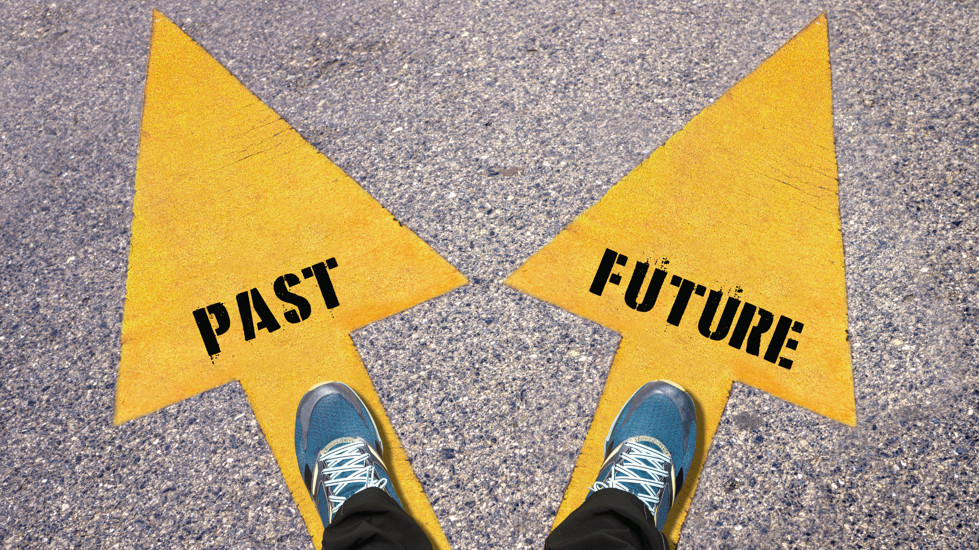 Pessoa vista de cima com os pés sobre o asfalto, diante de duas setas amarelas no chão: uma apontando para ‘PAST’ (passado) e outra para ‘FUTURE’ (futuro).