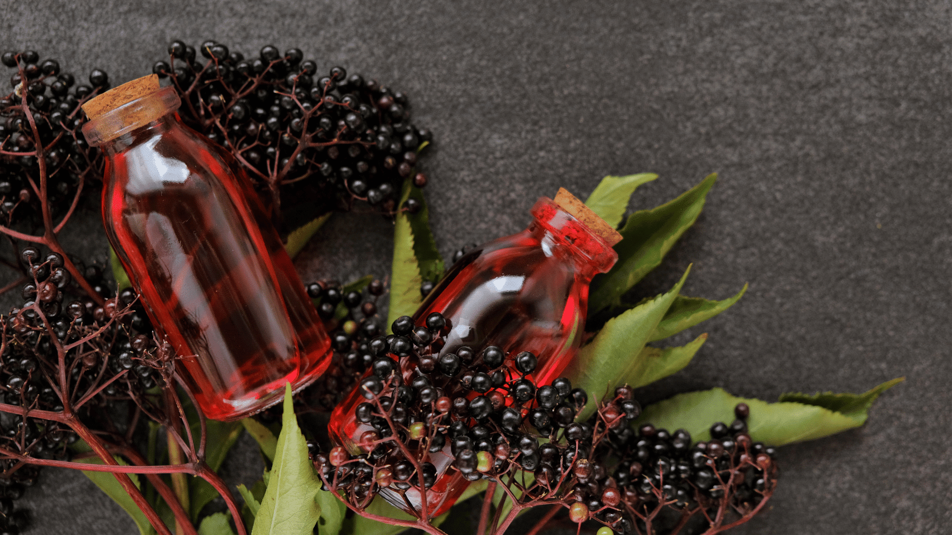 Cachos de frutos roxos escuros de sabugueiro em meio a folhas verdes e dois frascos de vidro vazios.