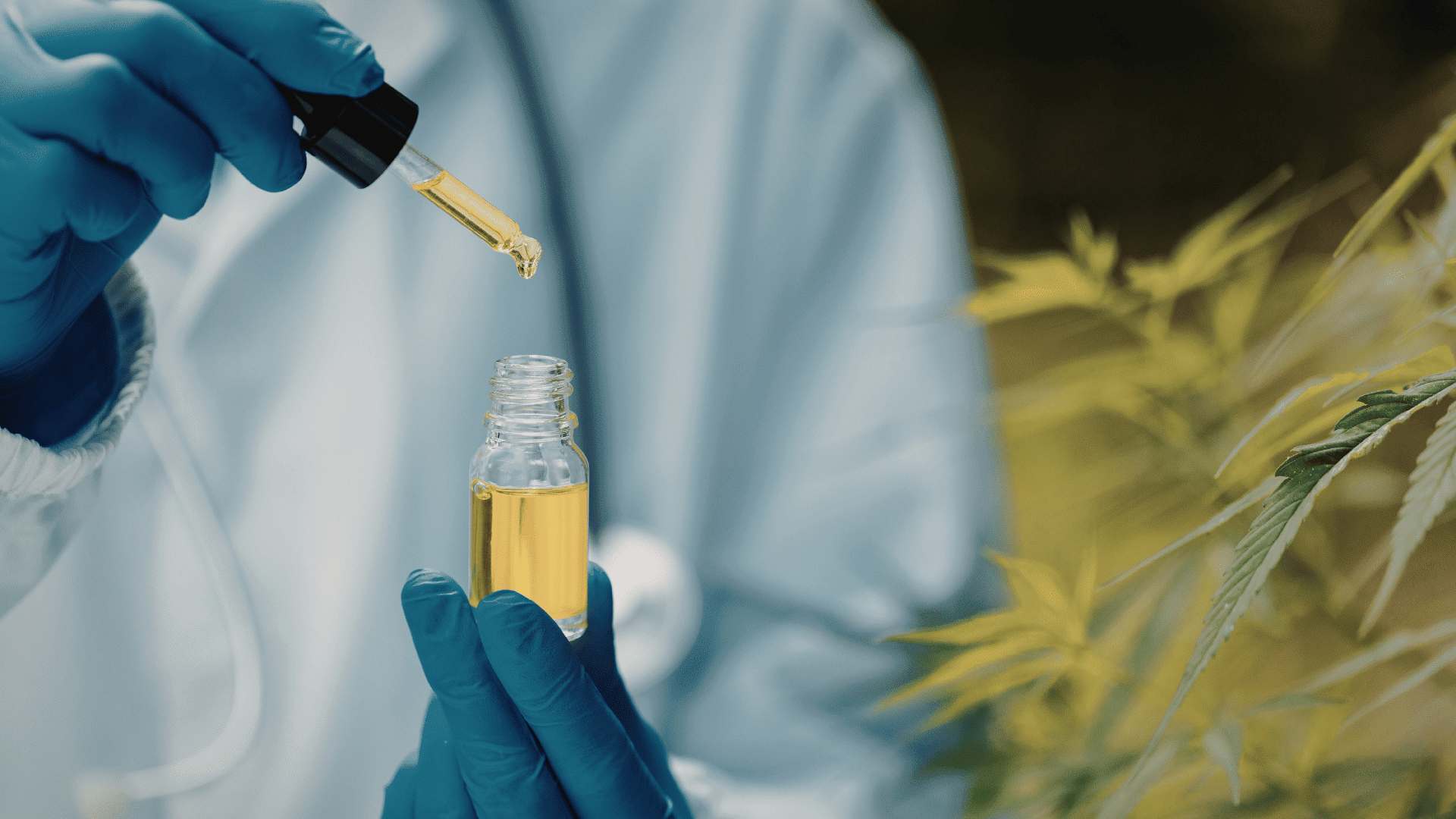As mãos de um cientista estão em destaque extraindo o óleo da cannabis e o inserindo em um frasco.