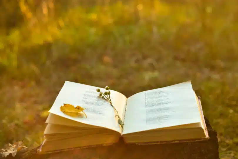 Livro aberto, com uma caneta e pétala de rosa amarela no meio, colocado em cima de tronco de cortado, no meio de um parque.